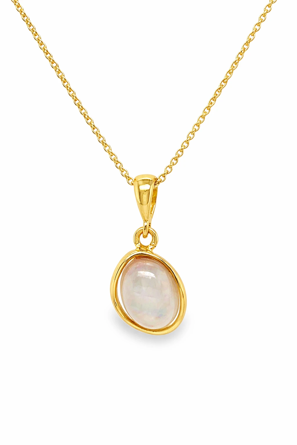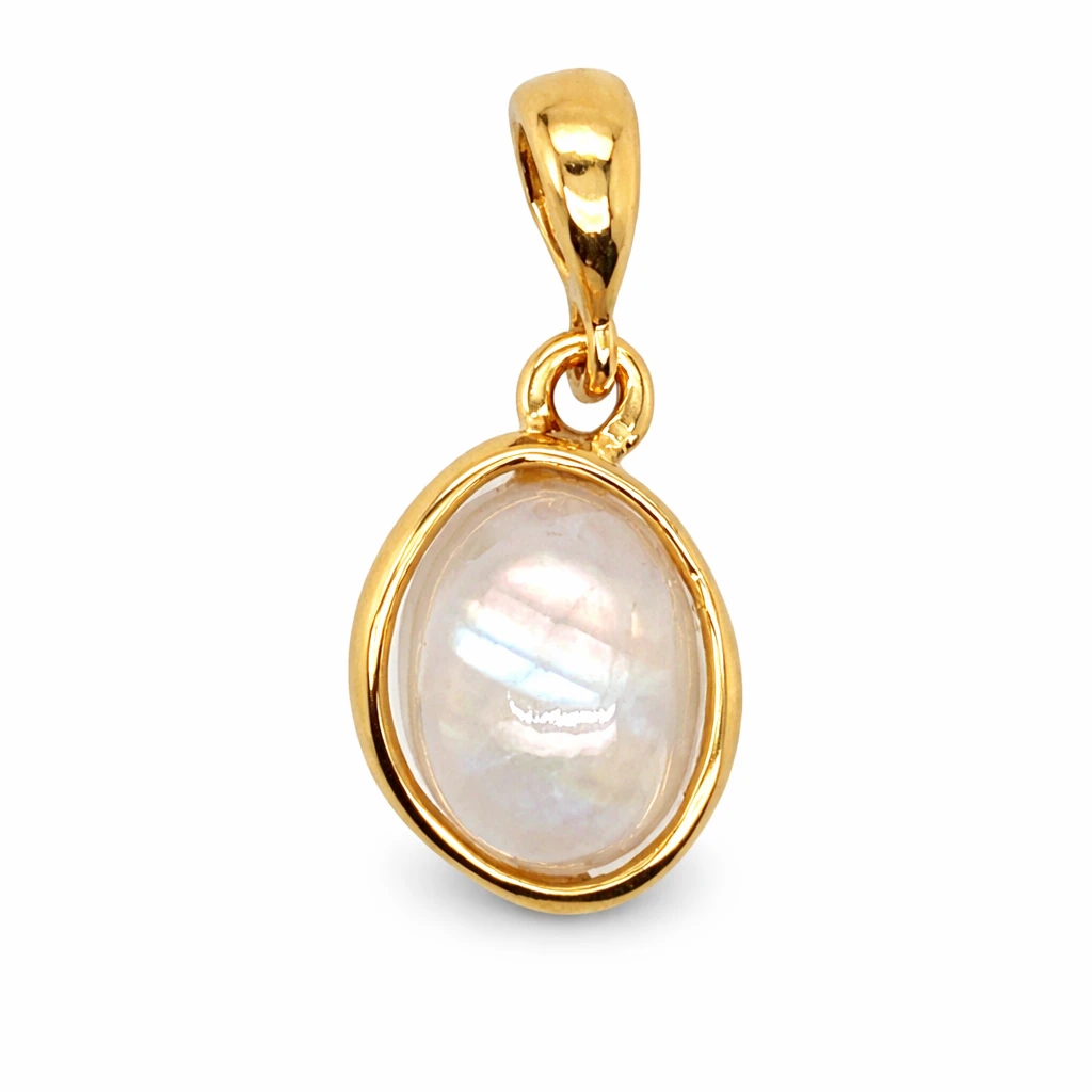 Głównym elementem wisiorka jest KAMIEŃ KSIĘŻYCOWY, który został starannie osadzony w srebrnej oprawie próby 925, które zostało pozłocone warstwą o grubości dwóch mikronów. Biżuteria pokryta taką powłoką galwaniczną, przy odpowiednim użytkowaniu będzie długo cieszyła się świeżością oraz złotym blaskiem.