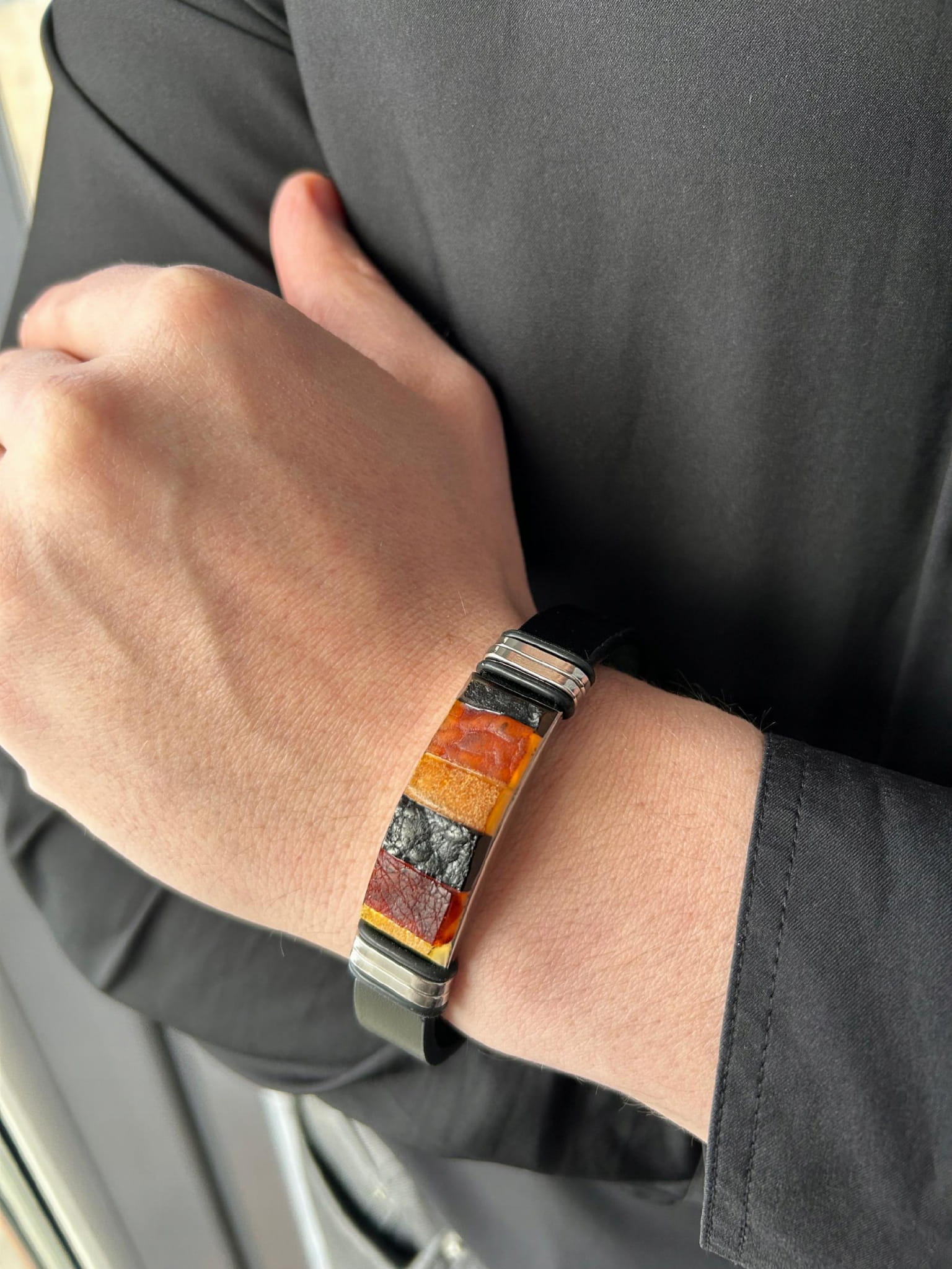 ✅Elegancja i Styl: Bransoleta męska z bursztynem i skórą to wyjątkowy dodatek, który łączy w sobie elegancję i surowość. Ten designerski element męskiej biżuterii przyciąga uwagę swoim unikalnym połączeniem naturalnych materiałów.