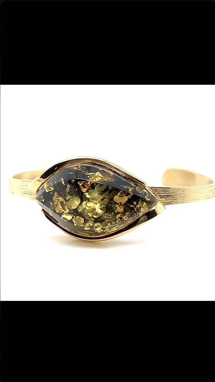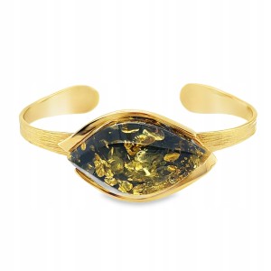 ✔️ Elegancka bransoletka wykonana ze srebra pokrytego warstwą złota, ozdobiona naturalnym bursztynem o wyjątkowej, zielonej barwie.