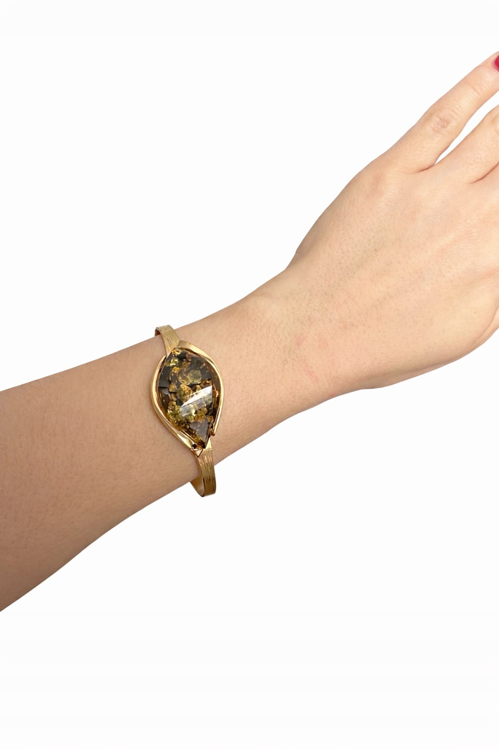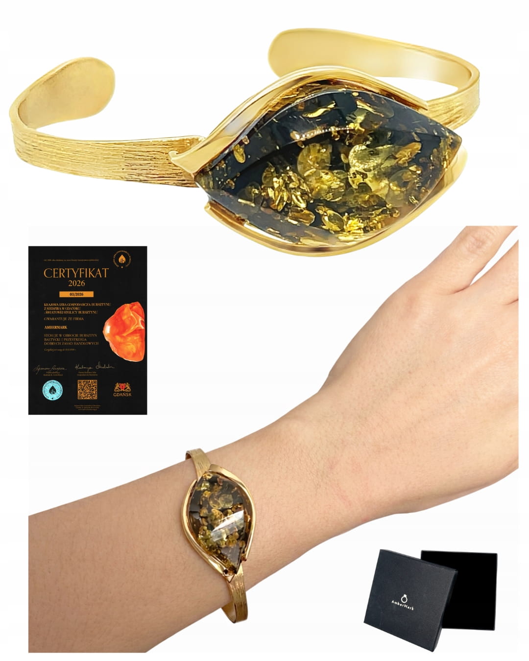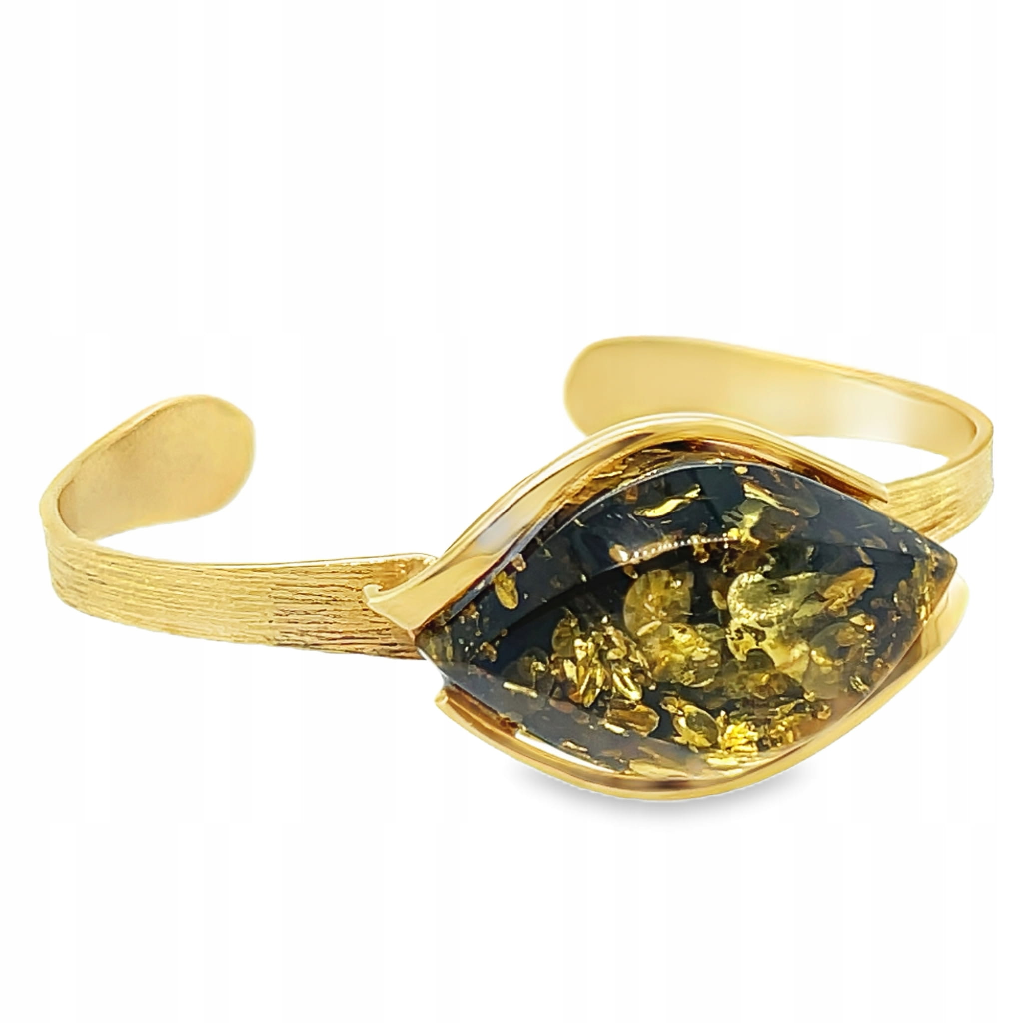 ✔️ Zielony bursztyn pięknie kontrastuje z ciepłym odcieniem pozłacanej oprawy, tworząc harmonijną i wyrafinowaną kompozycję.