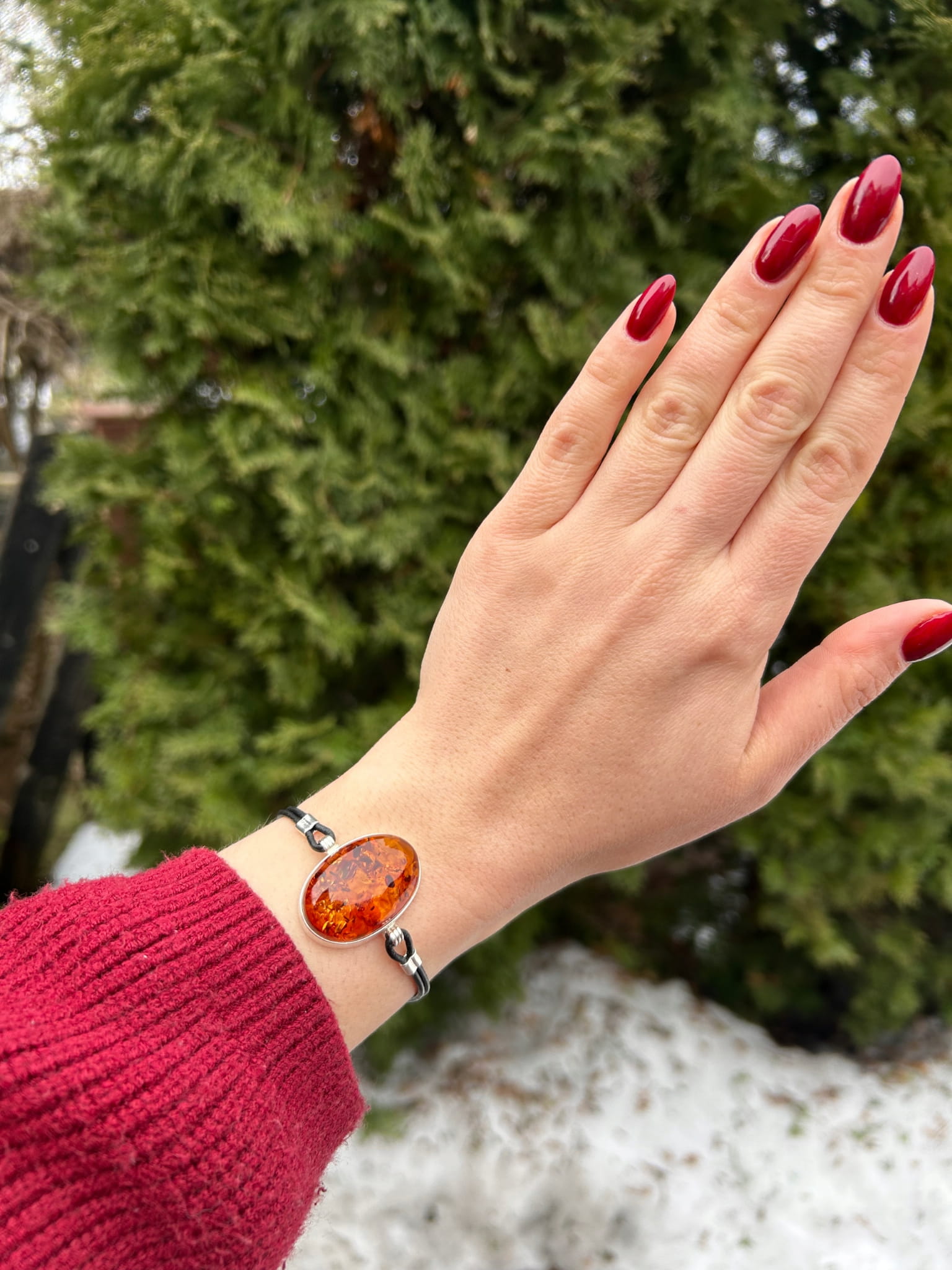 ✔️ Elegancka bransoletka wykonana ze srebra, ozdobiona naturalnym bursztynem o wyjątkowej, głębokiej koniakowej barwie.