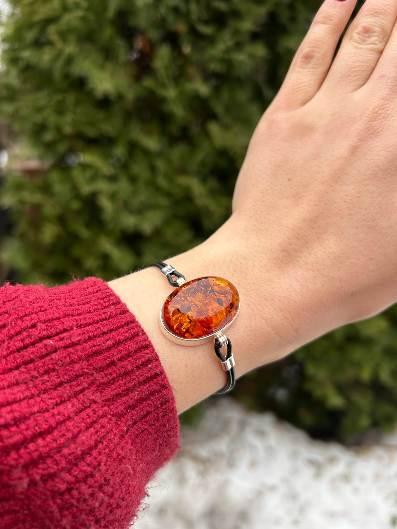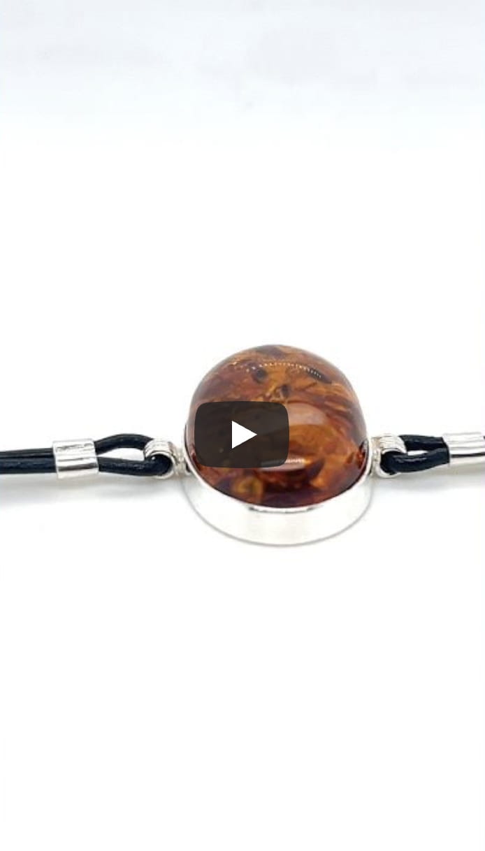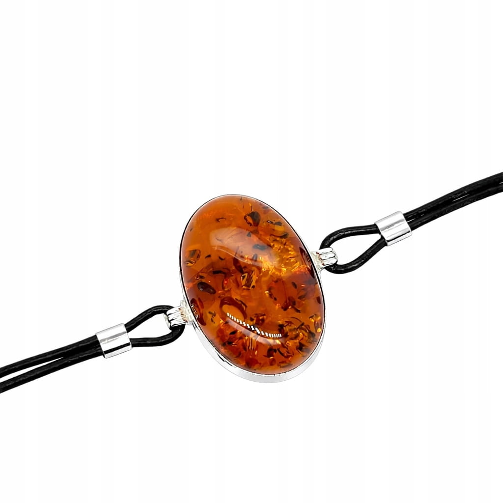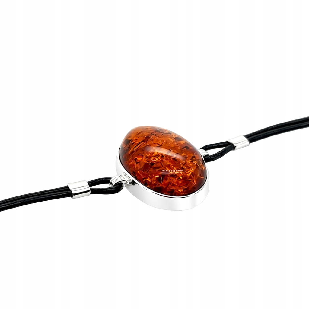 Srebrna bransoletka z koniakowym bursztynem na skórzanym rzemieniu