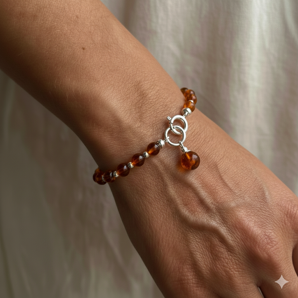 ✔️ Gładko polerowana powierzchnia bursztynu odbija światło, nadając bransoletce eleganckiego blasku i wyrazistości.