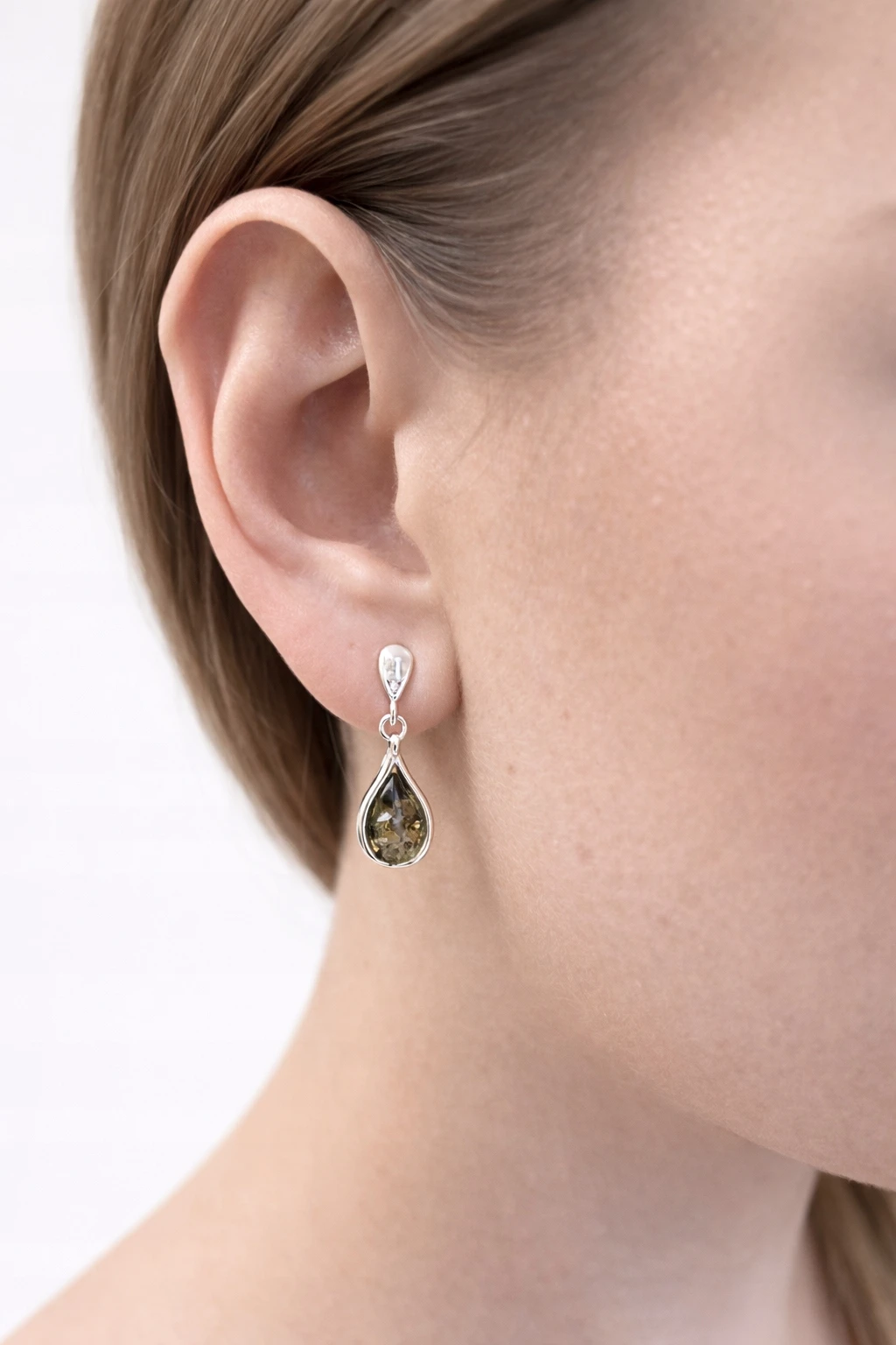 ✔️ Subtelne kolczyki z naturalnym bursztynem w zielonkawym odcieniu, oprawione w srebro. Delikatnie rozświetlają ucho i dodają stylizacji elegancji bez przesady.