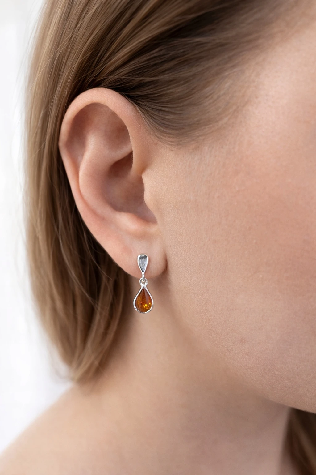 ✔️ Subtelne kolczyki z naturalnym bursztynem w koniakowym odcieniu, oprawione w srebro. Delikatnie rozświetlają ucho i dodają stylizacji elegancji bez przesady.