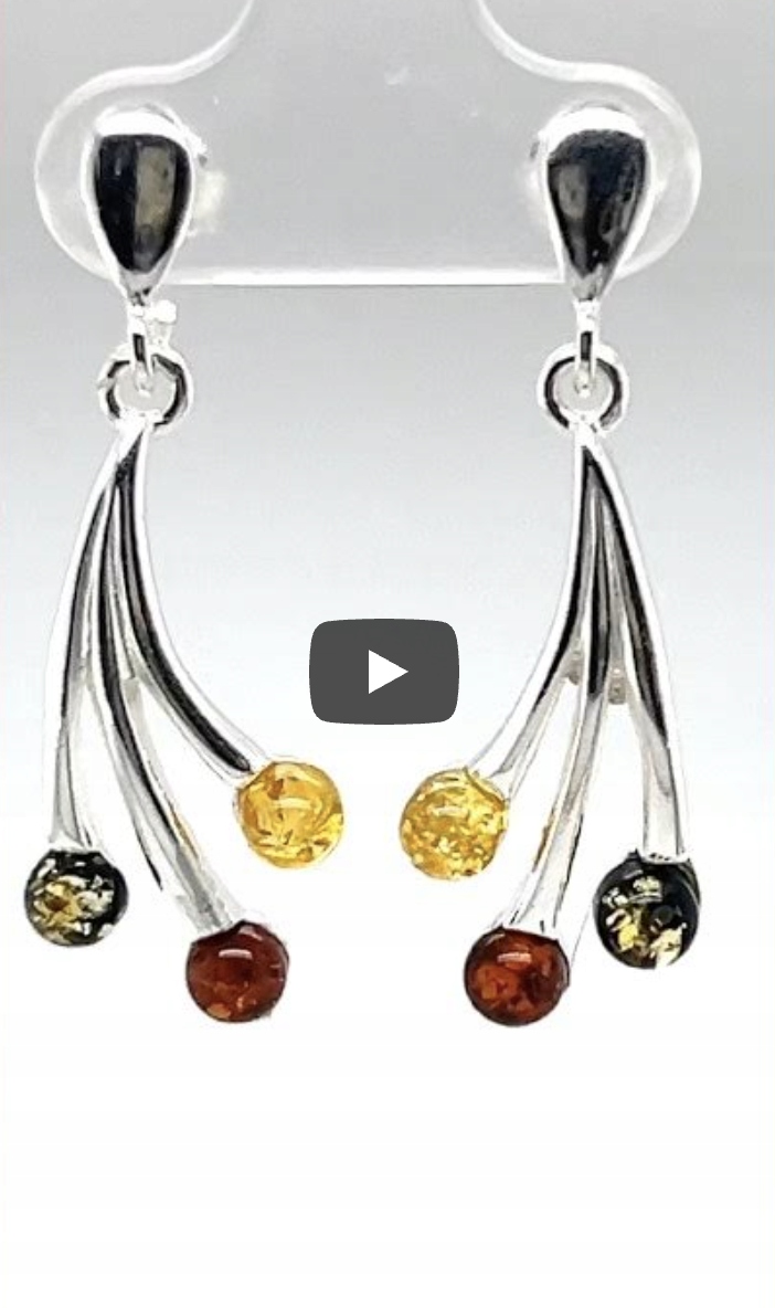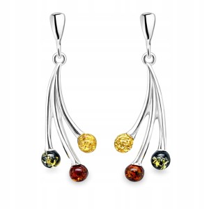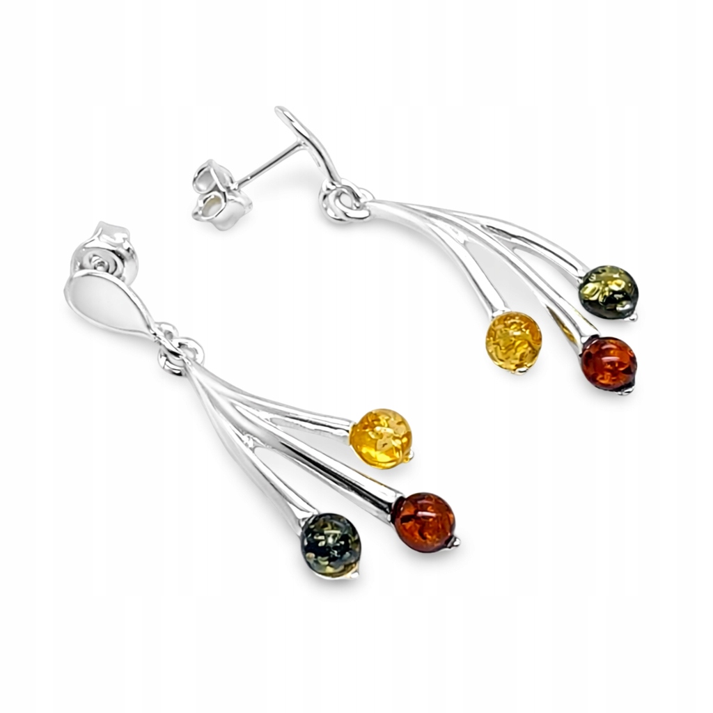 ✔️ Delikatne, srebrne kolczyki o smukłej, rozgałęzionej formie zakończone trzema drobnymi kulkami naturalnego bursztynu w odcieniach miodu, koniaku i zieleni. Ich finezyjny układ przypomina lekką gałązkę lub krople zatrzymane w ruchu.