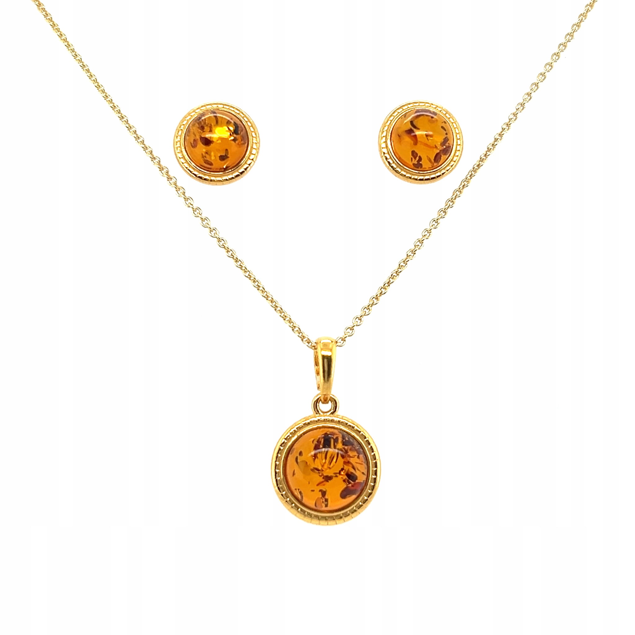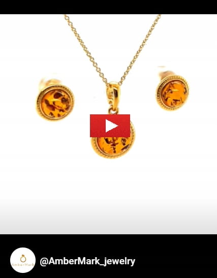 Głównym elementem kompletu jest bursztyn bałtycki, który został starannie osadzony w srebrnej oprawie próby 925, które zostało pozłocone warstwą o grubości dwóch mikronów. Biżuteria pokryta taką powłoką galwaniczną, przy odpowiednim użytkowaniu będzie długo cieszyła się świeżością oraz złotym blaskiem.