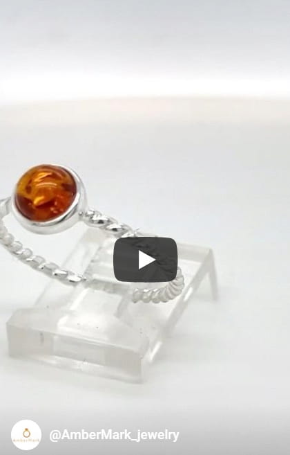 Głównym elementem pierścionka jest bursztyn bałtycki, który został starannie osadzony w srebrnej oprawie próby 925.