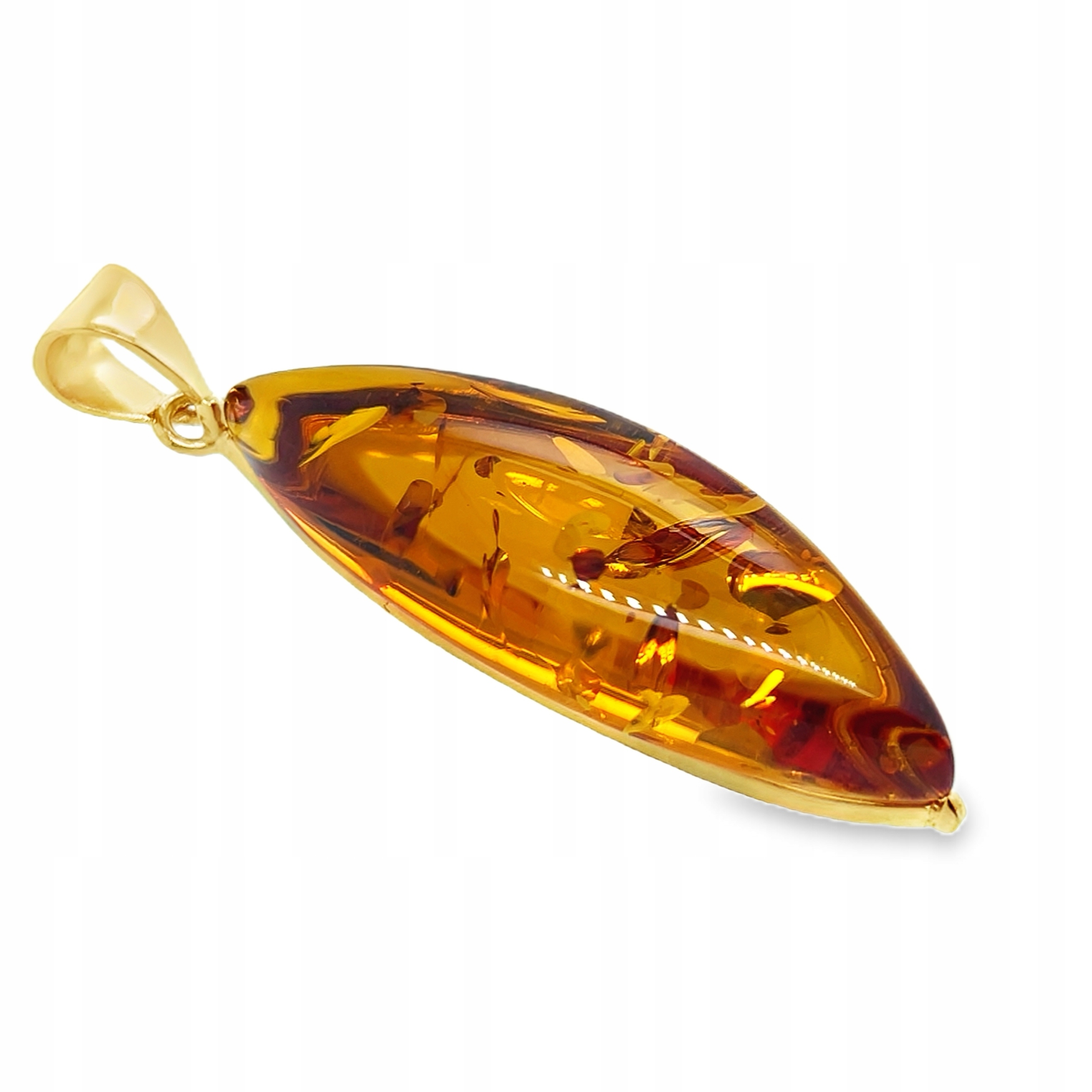 Głównym elementem wisiorka jest bursztyn bałtycki, który został starannie osadzony w srebrnej oprawie próby 925, które zostało pozłocone warstwą o grubości dwóch mikronów. Biżuteria pokryta taką powłoką galwaniczną, przy odpowiednim użytkowaniu będzie długo cieszyła się świeżością oraz złotym blaskiem.