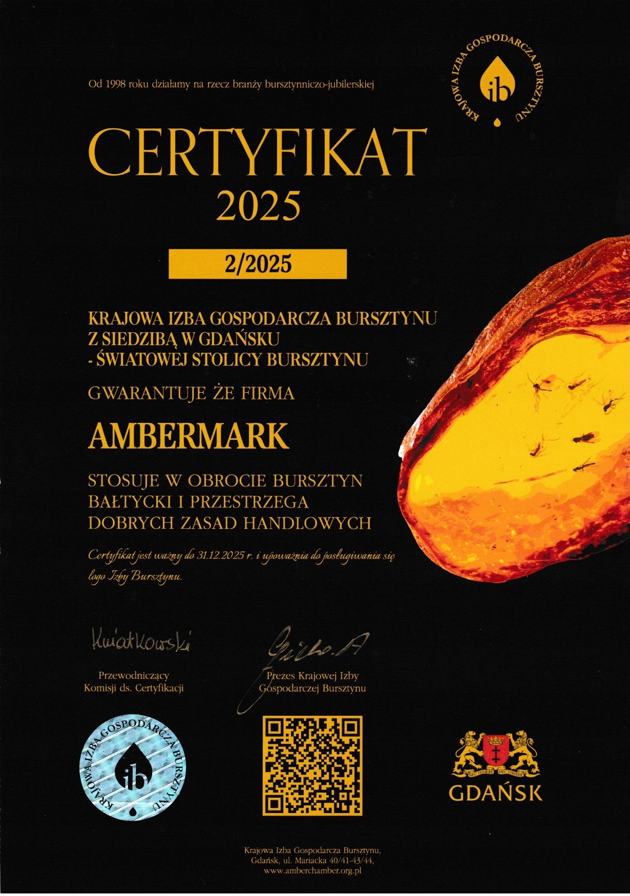 ✅ Do każdego zamówienia dołączamy pudełko z logo firmy, wypełnione gąbką jubilerską oraz certyfikat Krajowej Izby Gospodarczej Bursztynu (https://amberchamber.org.pl), gwarantujący, że stosujemy w obrocie bursztyn bałtycki i przestrzegamy dobrych zasad handlowych.